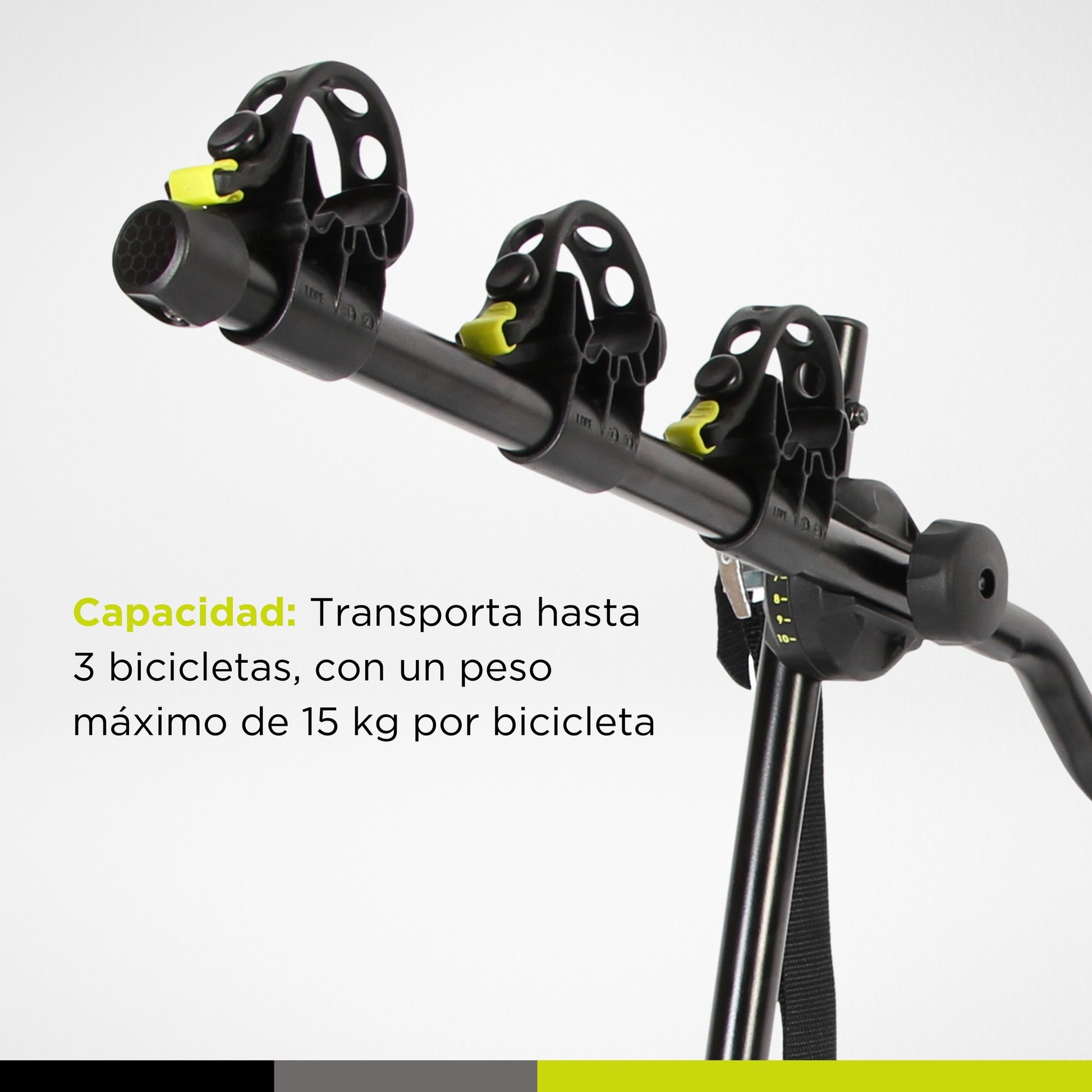 - Capacidad: Transporta hasta 3 bicicletas con un peso máximo combinado de 45 kg (cada bicicleta puede pesar hasta 15 kg).
